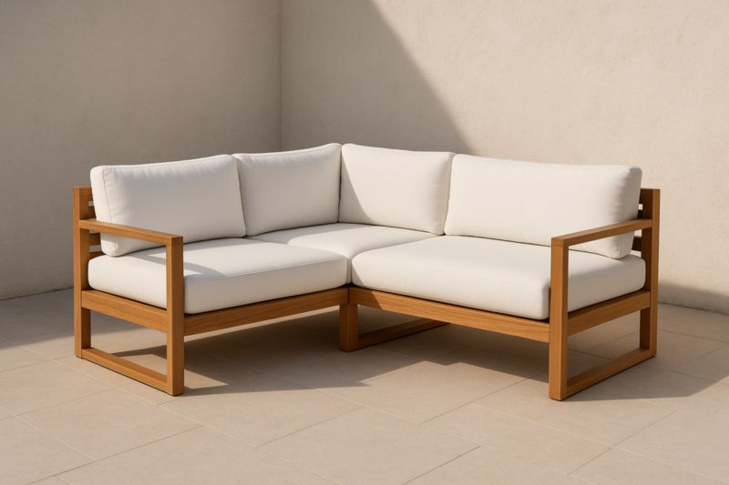 Divano ad angolo da esterno in legno con cuscini bianchi