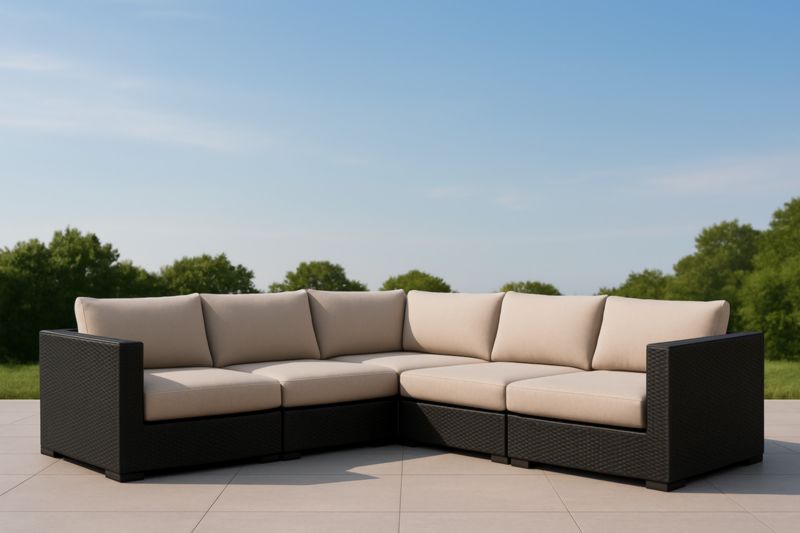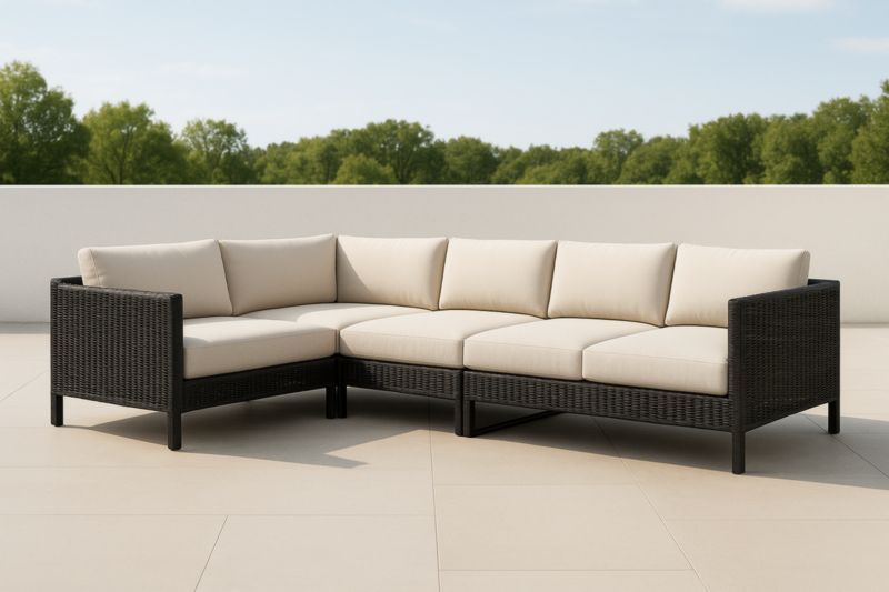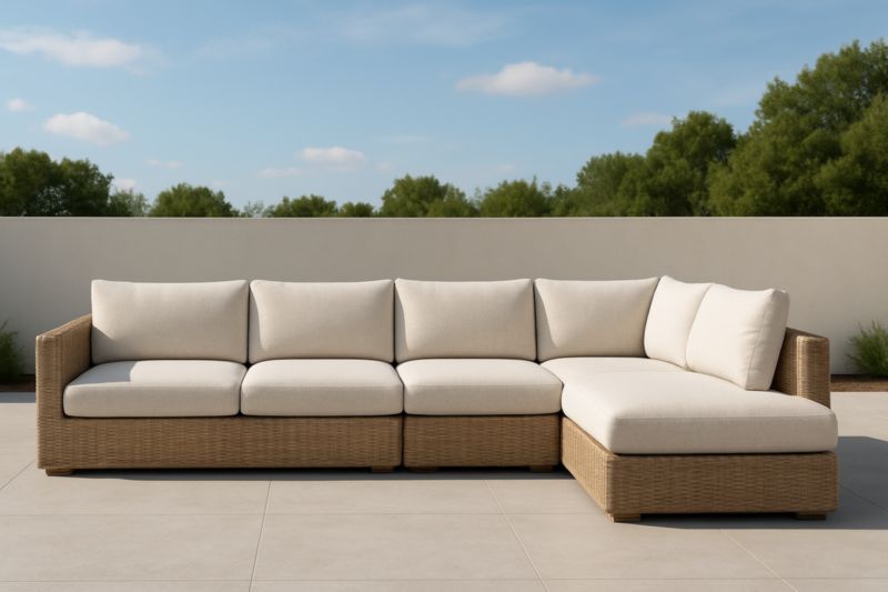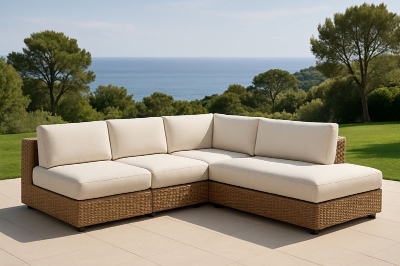 Divano ad angolo modulare in rattan sintetico con cuscini beige
