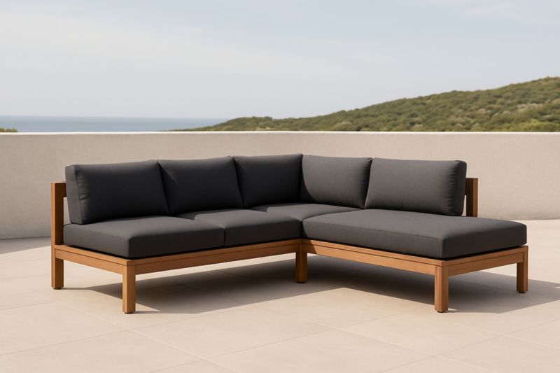 Divano ad angolo da esterno in legno con cuscini grigi
